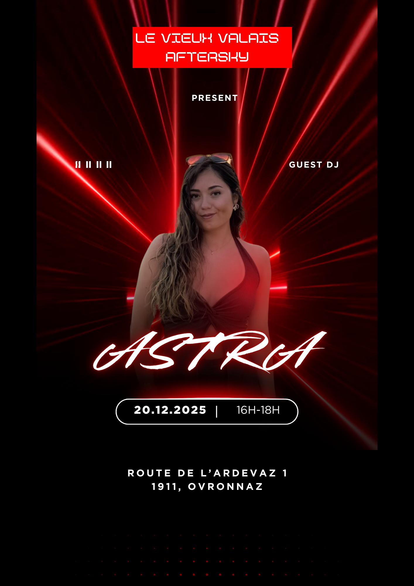 Join us for an electrifying late afternoon on the terrace with DJ ASTRA, our guest DJ ready to make the Vieux Valais Aftersky vibrate.